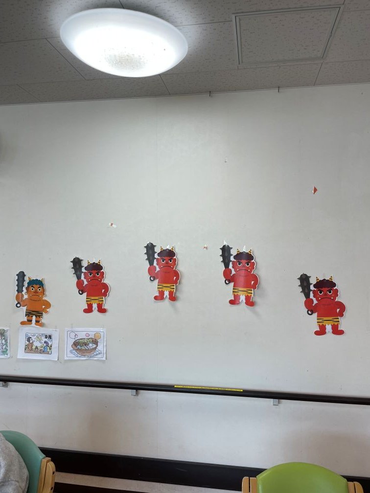 こんにちは、西山寮です!各フロアで節分をおこないました。職員が鬼になって利用者様に豆(カラーボール)を投げていただきました。居室の利用者様は突然鬼がきてびっくり!!でも楽しまれていました!
